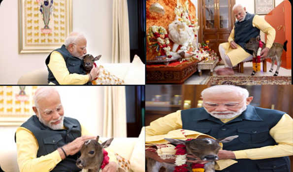 PM मोदी ने बछिया को अपनी गोदी में रखकर दुलारा।