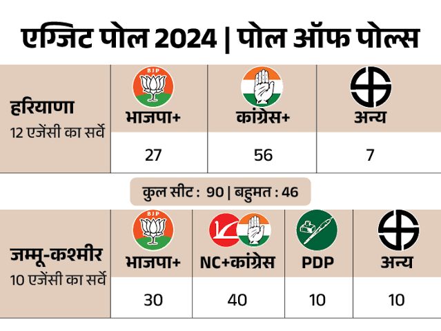 हरियाणा और जम्मू-कश्मीर की 90-90 विधानसभा सीटों पर वोटिंग पूरी हो गई है। वोटों की गिनती 8 अक्टूबर को होगी। उससे पहले एग्जिट पोल और उसके आधार पर पोल ऑफ पोल्स। दोनों राज्यों में सरकार बनाने के लिए 46 सीटें जरूरी हैं।