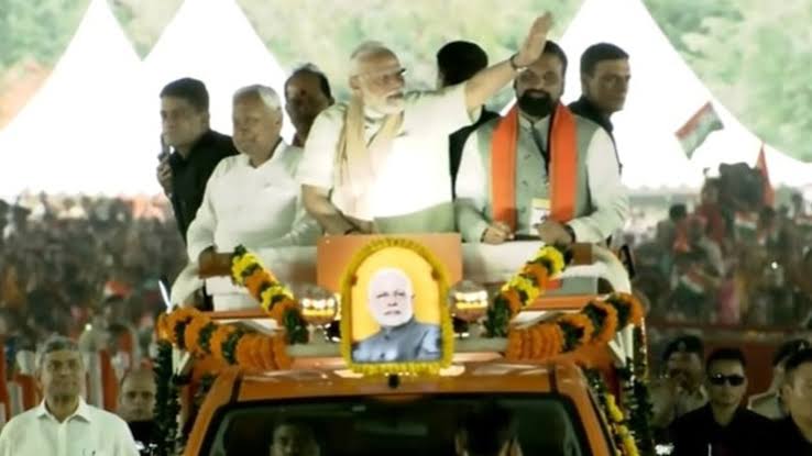 वे मंच तक खुली गाड़ी से लोगों का अभिवादन करते हुए पहुंचे। इस दौरान उनके साथ CM नीतीश कुमार और डिप्टी CM सम्राट चौधरी भी थे।