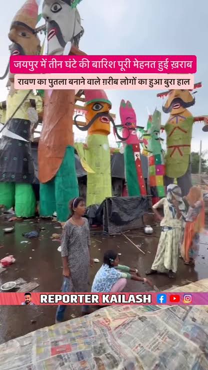 जयपुर के इलाकों में 2 से 3 फीट पानी भर गया। दशहरा पर रावण दहन के लिए तैयार पुतले भी पानी में बहते दिखे। कोटा में 221 फीट ऊंचा रावण का पुतला भीग गया। दावा है कि यह दुनिया का सबसे ऊंचा रावण का पुतला है। मौसम विभाग ने राजस्थान में दशहरे के दिन, 2 अक्टूबर को भी तेज बरसात की आशंका जताई है।