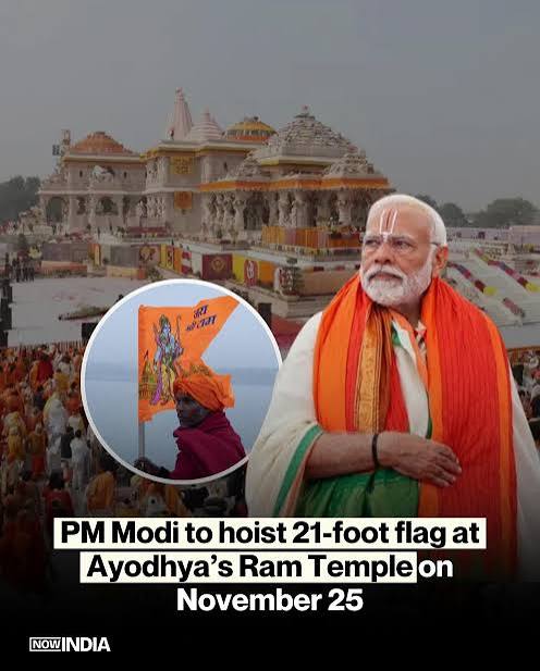 अयोध्या के राममंदिर के शिखर पर ध्वज फहराने की तैयारियां पूरी हो चुकी हैं। 25 नवंबर को PM नरेंद्र मोदी बटन दबाकर ध्वज को फहराएंगे, उनके साथ मोहन भागवत भी मौजूद रहेंगे। इसके लिए 12 बजे से 12.30 बजे के बीच अभिजीत मुहूर्त तय किया गया है।