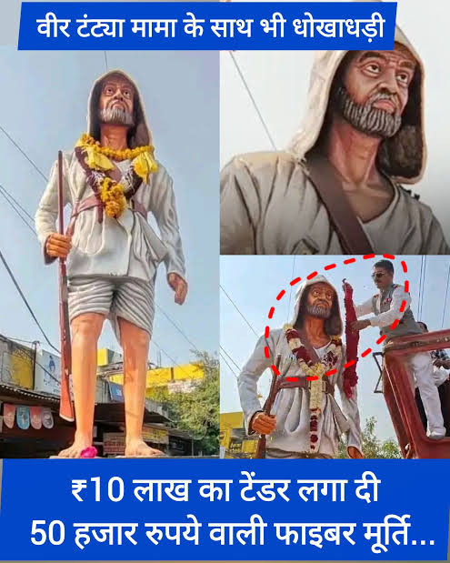 खरगोन में आदिवासी नायक टंट्या मामा “रॉबिन हुड ऑफ इंडिया” की मूर्ति को लेकर बड़ा घोटाला सामने आया है। नगर पालिका ने करीब 10 लाख रुपए की धातु (ब्रॉन्ज/पत्थर) की मूर्ति खरीदने का टेंडर जारी किया था। इसकी जगह करीब 1 लाख रुपए की फाइबर (FRP) से बनी मूर्ति लगा दी गई। विधायक बालकृष्ण पाटीदार और कलेक्टर भव्या मित्तल ने लोकार्पण भी कर दिया। मामला सामने आने के बाद आदिवासी समाज में नाराजगी है और प्रशासन की भूमिका पर भी सवाल उठ रहे हैं।