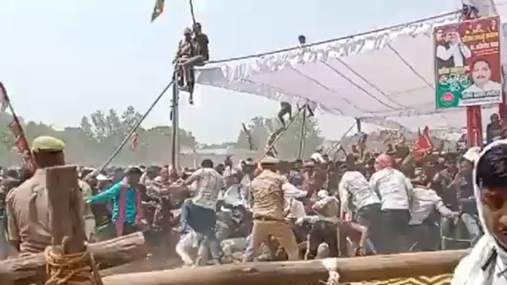 आजमगढ़ में अखिलेश यादव की रैली में मंगलवार को फिर समर्थक बेकाबू हो गए। बैरिकेडिंग तोड़कर मंच के करीब तक पहुंच गए। पुलिस ने लाठीचार्ज करके समर्थकों को वहां से हटाया।